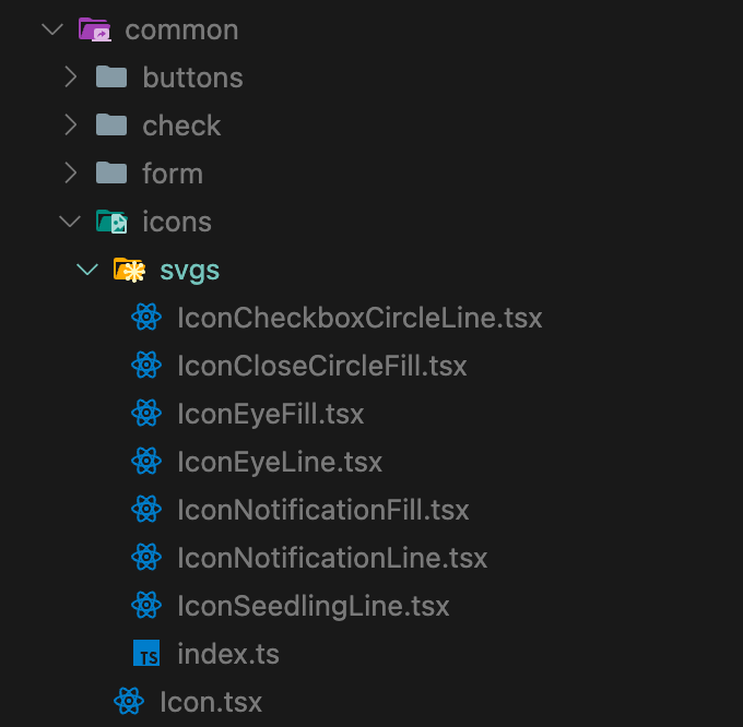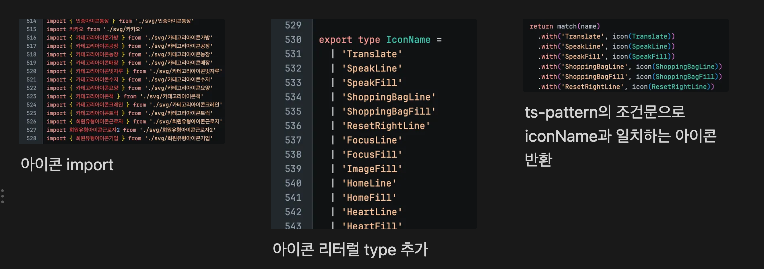 ts-pattern으로 return하는 구조입니다. 현재 import하는 아이콘이 540개인데, 트리쉐이킹이 되지 않아 Icon 컴포넌트를 import 했을 때 타입 추론이 매우 느려지는 불편함이 있었습니다. (+ 번들사이즈 증가)